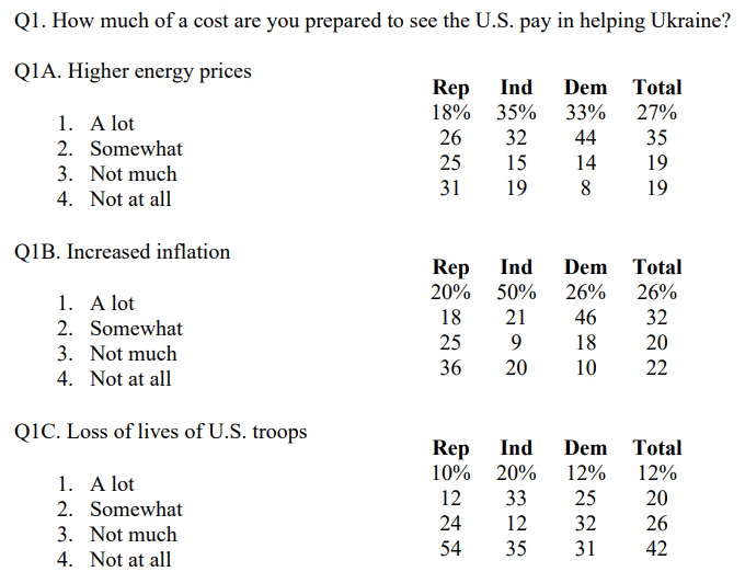 При этом наблюдается большая разница в ответах в зависимости от политических предпочтений респондентов: о готовности к таким последствиям помощи Украине заявили 77% демократов, 67% независимых, но лишь 44% республиканцев.