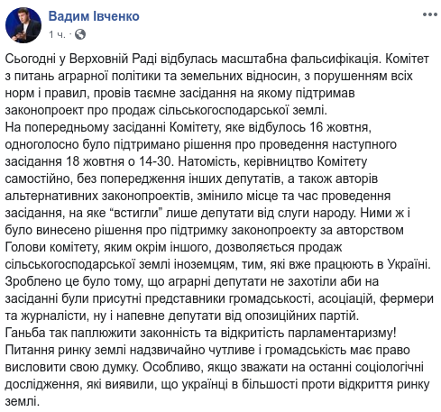 “Комитет по вопросам аграрной политики и земельных отношений, с нарушением всех норм и правил, провел тайное заседание на котором поддержал законопроект о продаже сельскохозяйственной земли. На предыдущем заседании Комитета, которое состоялось 16 октября, единогласно было поддержано решение о проведении следующего заседания 18 октября в 14:30. Но, руководство Комитета самостоятельно, без предупреждения других депутатов, а также авторов альтернативных законопроектов, изменило место и время проведения заседания, на которое «успели» только депутаты от слуги народа. Ими же и было принято решение о поддержке законопроекта авторства Председателя комитета, которым помимо прочего, разрешается продажу сельскохозяйственной земли иностранцам, тем, которые уже работают в Украине” – написал на своей странице в Facebook Вадим Ивченко.