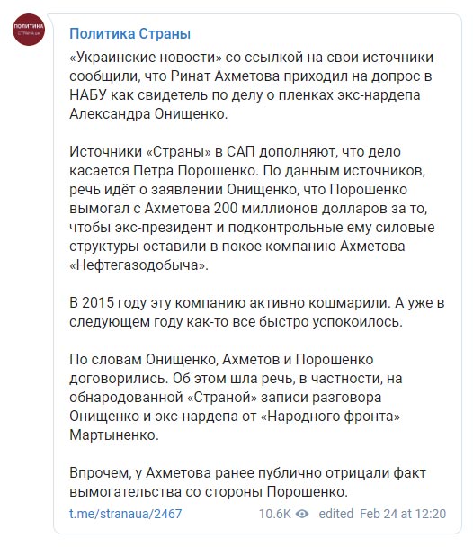 Источники «Страны» в САП дополняют, что дело касается Петра Порошенко. По данным источников, речь идёт о заявлении Онищенко, что Порошенко вымогал с Ахметова 200 миллионов долларов за то, чтобы экс-президент и подконтрольные ему силовые структуры оставили в покое компанию Ахметова «Нефтегазодобыча», пишет Telegram-канал «Политика Страны».
