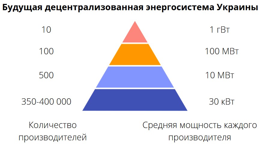 Вот как описывает такую децентрализованную систему глава правления Восточноевропейской ассоциации развития водородной экономики Александр Пилипенко: “Будущую систему можно представить в виде условной пирамиды, на вершине которой десяток производителей электроэнергии с гигаваттными мощностями. Далее — сотня производителей с мощностями в сотни МВт. Затем — полтысячи, которые способны выдавать в сеть десятки МВт. Но в основании этой “пирамиды” должны быть 350-400 тыс производителей с мощностями порядка 30 кВт”. Очевидно, что ни у какой россии не хватит ракет на то, чтобы существенно повредить такую энергосистему. Более того, именно такая “пирамида” позволит нам в глазах Европы стать устойчивым и надежным поставщиком “зеленой” энергии без углеродного следа.