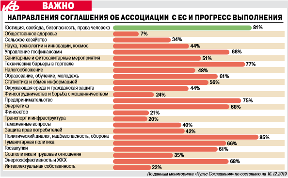 Явление «Пульса» народу вызывает недоумение. Соглашение об ассоциации мониторят по 24 направлениям, и ни одно из них на 100% не укладывается в график. Лучший результат – в сфере политического диалога, нацбезопасности и обороны: 85% выполнено, а остальное просрочено (см. Важно).