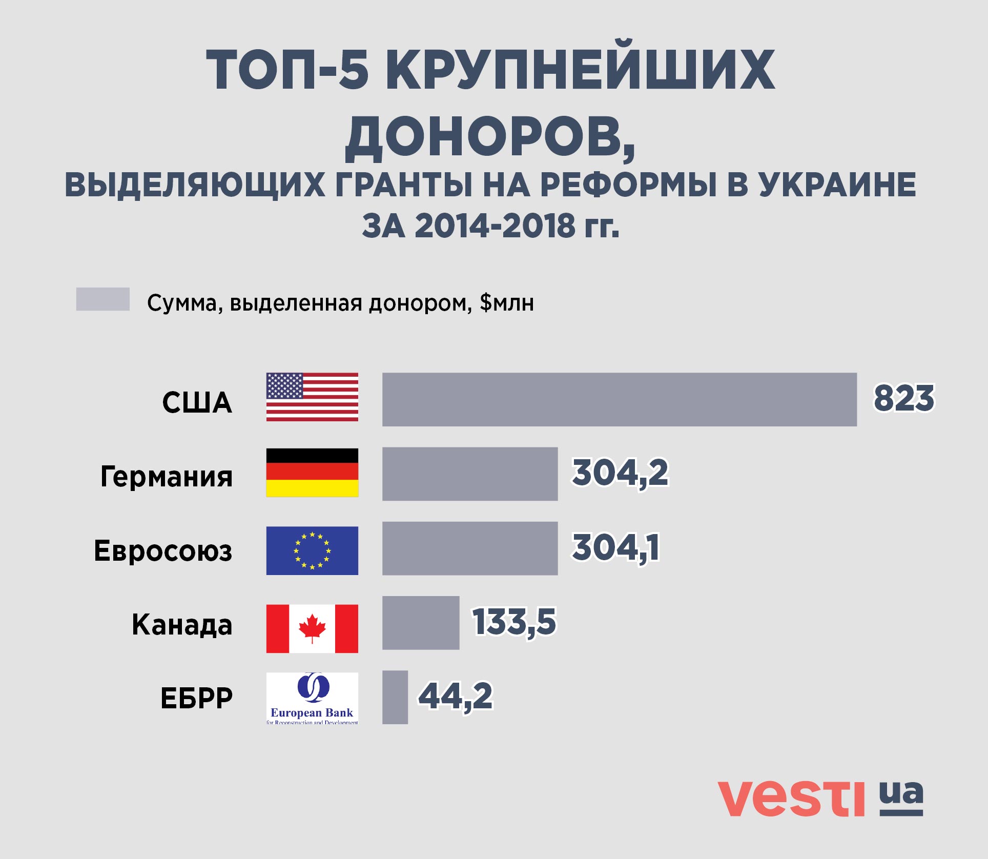 Компанию американцам в первой пятерке грантодателей составили Германия, Евросоюз, Канада и “Европейский банк реконструкции и развития”.