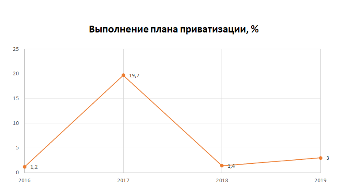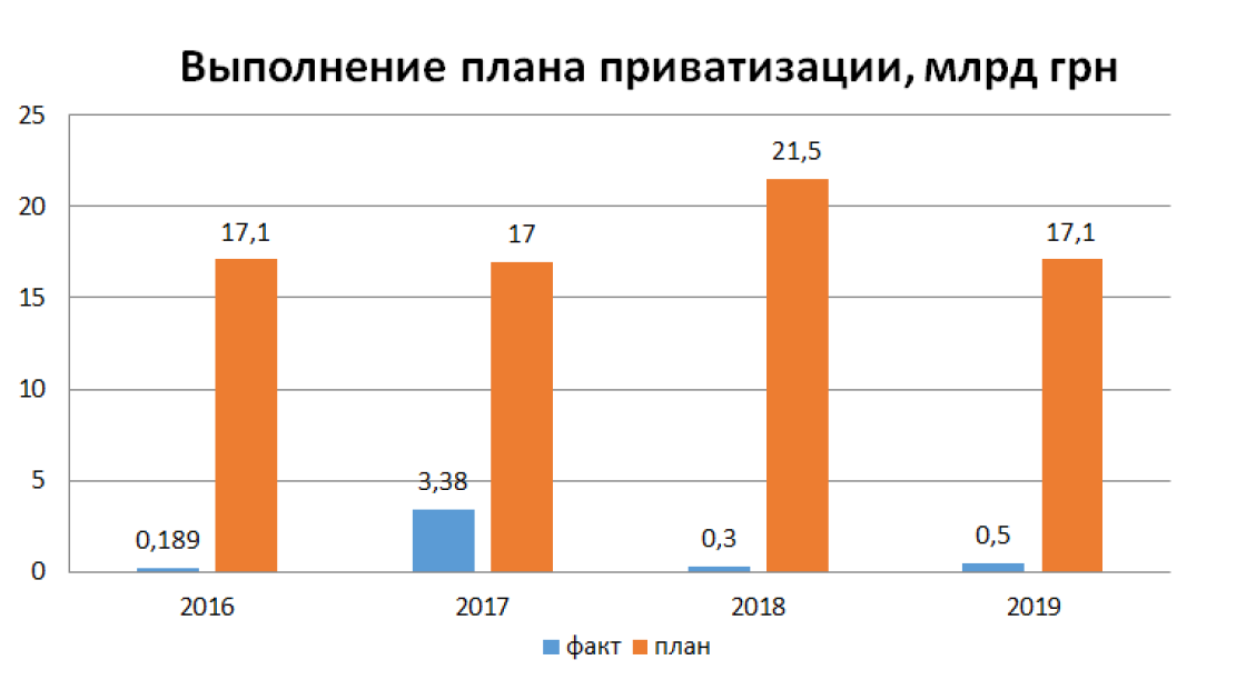 Начиная с 2016-го в планах бюджета неизменно закладывались суммы поступлений от приватизации в размере от 17 млрд до 21,5 млрд грн, которые никогда не выполнялись, так как данный показатель был призван заретушировать скрытый бюджетный дефицит от МВФ и использовался в качестве технического индикатора. Процент выполнения плана колебался от 1,2 до 3% с максимумом в 19,7% в 2017-м, когда поступления от приватизации составили 3,38 млрд грн за счет приватизации ряда энергокомпаний (и сейчас их собственники хотят компенсировать понесенные расходы с помощью так называемых RAB-тарифов, подтверждая тезис о гибридности нашей приватизации).