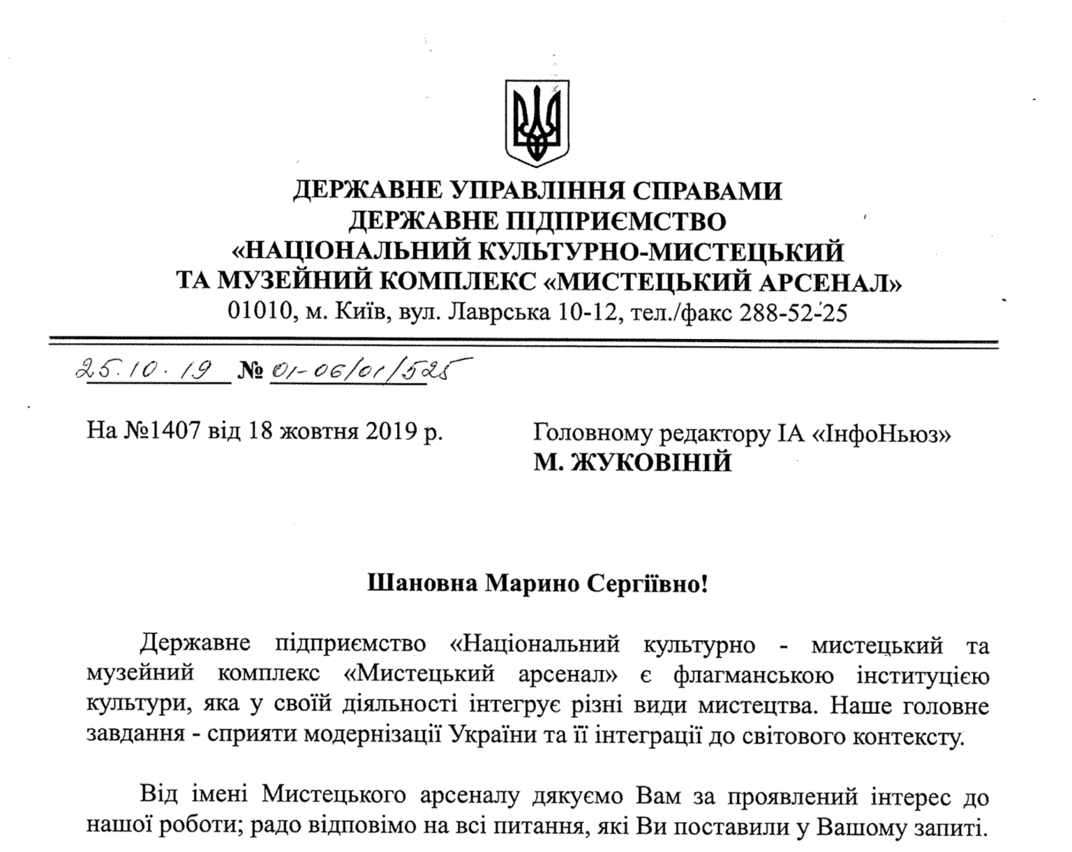 Получив сведения о тендере, «ИнфоНьюз» обратился с журналистским запросом о специфике проведения тендера к руководителю «Мистецького Арсенала» Олесе Островской-Лютой.