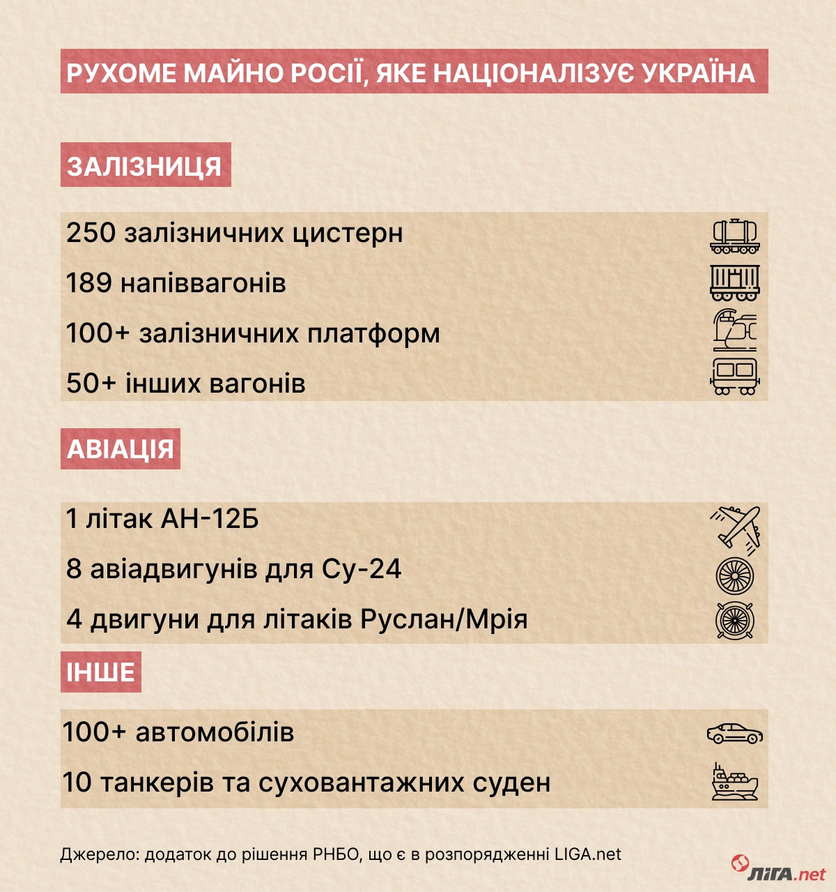 В частности, национализируют почти 200 полувагонов ОАО «Российские железные дороги», а также сотни вагонов, железнодорожных платформ, цистерн. Также Украина заберет себе самолет Ан-12Б, 12 авиадвигателей, 10 крупных судов и более 100 легковых и грузовых автомобилей российских компаний. Среди них – как старые легковые авто ИЖ (известные как «пирожок»), так и Audi A6 или Toyota Land Cruiser. Детали – в инфографике.