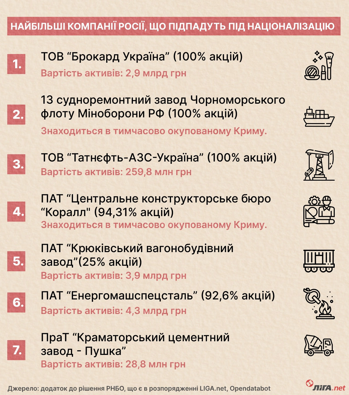 Среди них, например, крупная торговая сеть Brocard (по данным СНБО и СБУ, компания принадлежит россиянке Татьяне Володиной через кипрскую Indenon Holdings Limited, но эта фирма контролируется Министерством промышленности и торговли РФ). Также отойдут Украине корпоративные права производителей цемента, металла и вагонов. Конечными владельцами этих компаний оказались российские госорганы и предприятия (в том числе Роскосмос и Росатом). Национализации подлежит доля, которой владеет РФ. Детали – в инфографике.