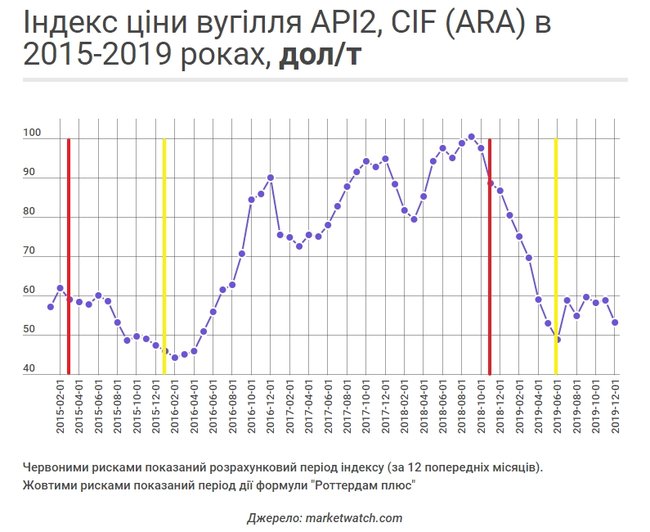 Показательно, что в середине 2019 на отмене Р + настаивал именно ДТЭК. Почему? Потому что в этот момент индекс API2 резко пошел вниз. За полгода он снизился с $ 100 до $ 50 за тонну.