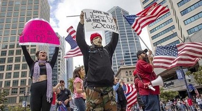 Начавшийся в Огайо и Мичиган бунт против карантина быстро перебросился и на другие штаты — Пенсильванию, Вирджинию, Миннесоту, Техас. При этом акции протеста широко освещаются на пропрезидентском телеканале Fox и сопровождаются пространными комментариями ведущих под лозунгами: «Время вернуть нашу свободу!» и «Не дадим убить 2-ю поправку к конституции!» (напомним, что она дает право американцам на владение и ношение оружия).