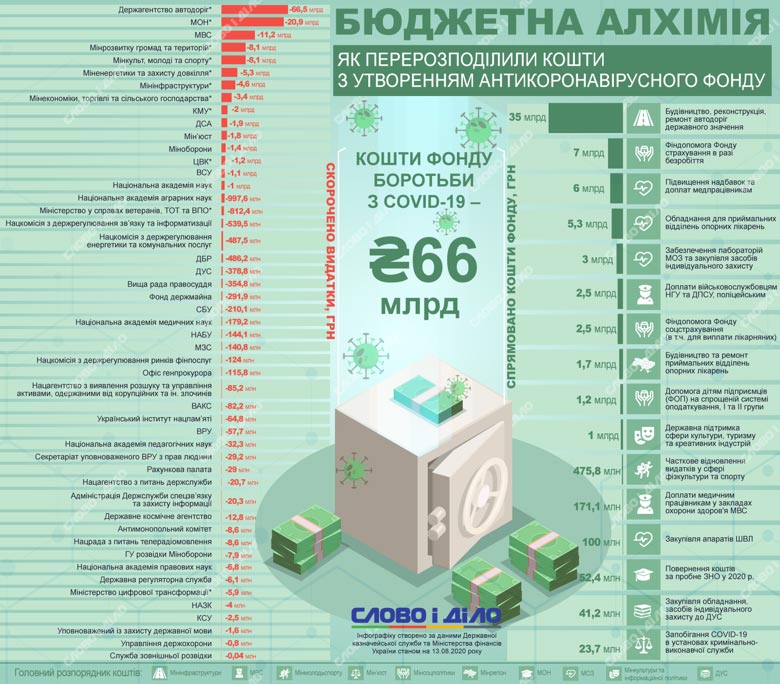 Правительство ввело карантин из-за коронавируса 12 марта 2020 года. На следующий день Верховная рада приняла изменения в госбюджет в связи с созданием в Украине фонда борьбы с COVID-19. Для формирования фонда пришлось урезать расходы многих министерств и ведомств и перераспределить средства на выплаты повышенных зарплат медработникам, компенсаций безработным, а также строительство дорог в стране. «Слово и дело» исследовало, откуда забрали средства для формирования антивирусного фонда и куда их направили.