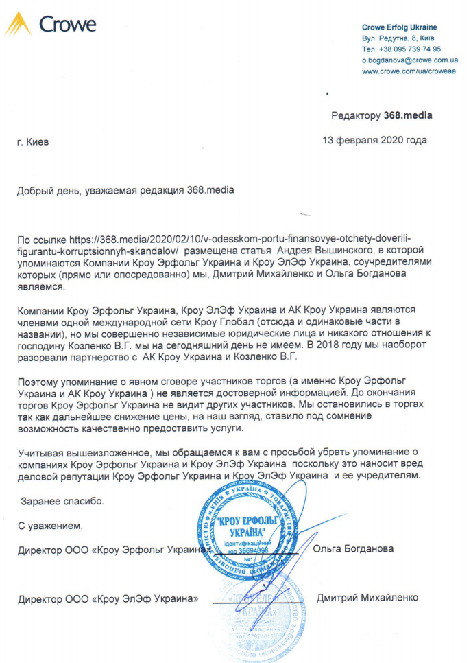 После этого в редакцию 368.media написали соучредители компаний «Кроу Эрфольг Украина» и «Кроу ЭлЭф Украина» Дмитрий Михайленко и Ольга Богданова, которые утверждают, что их фирмы не имеют никакого отношения к ООО «АК «Кроу Украина», хотя и работают в раках общей международной сети «Кроу Глобал».