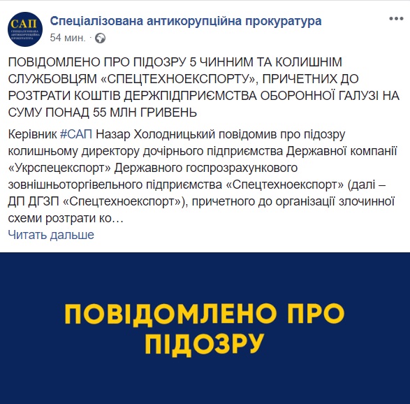 Руководитель Специализированной антикоррупционной прокуратуры Назар Холодницкий сообщил о подозрении бывшему директору дочернего предприятия государственной компании «Укрспецэкспорт» Государственного хозрасчетного внешнеторгового предприятия «Спецтехноэкспорт», причастного к организации преступной схемы растраты средств, причинившее государственному предприятию ущерб на сумму 55,5 млн гривен. Об этом в Facebook сообщает пресс-служба САП.