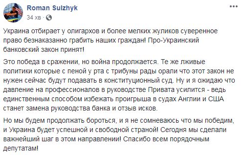 «Украина отбирает у олигархов и более мелких жуликов суверенное право безнаказанно грабить наших граждан! Про-Украинский банковский закон принят! Это победа в сражении, но война продолжается. Те же лживые политики которые с пеной у рта с трибуны Рады орали, что этот закон не нужен сейчас будут подавать в Конституционный Суд. Ну и я ожидаю, что давление на профессионалов в руководстве Привата усилится — ведь единственным способом избежать проигрыша в судах Англии и США станет замена руководства банка и отзыв исков. Но мы будем продолжать бороться, и я не сомневаюсь, что мы победим, и Украина будет успешной и свободной страной! Сегодня мы сделали важнейший шаг в этом направлении! Спасибо всем порядочным депутатам!» — заявил он.