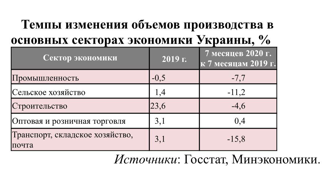 Реальный ВВП Украины уменьшился на 1,3% в первом квартале и на 11,4% — во втором квартале 2020-го относительно предыдущего года. Среди основных секторов экономики наибольшие потери от кризиса понесли транспорт, почтовая и курьерская деятельность (15,8% падения за семь месяцев 2020 года по сравнению с аналогичным периодом прошлого года) и производство сельскохозяйственной продукции (11,2%). Объемы промышленного производства уменьшились на 7,7%, при этом в наибольшей степени пострадали машиностроение, производство обуви, полиграфическая деятельность.