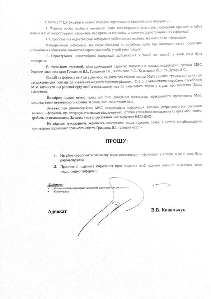 Прямая речь: «Официально. Защита требует от МВД опровержения лжи, в том числе, о причастности семьи Грищенко к убийству Павла Шеремета».