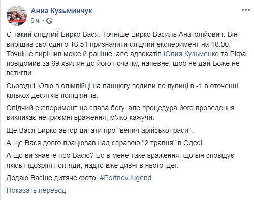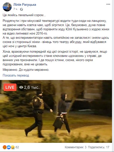 Во время следственного эксперимента подозреваемую по делу об убийстве Павла Шеремета волонтера и медика Юлии Кузьменко, которую обвиняют в том, что именно она прикрепила взрывное устройство к автомобилю убитого журналиста, водили по маршруту предполагаемых убийц, привязанной цепью к полицейскому.