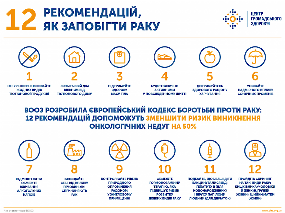 Онкология является второй среди болезней наиболее распространенной причиной смертности в Украине, уступая только сердечно-сосудистым заболеваниям. В 2020 году чаще всего обнаруживали рак груди, легких, толстой и прямой кишки, простаты, кожи и желудка. По данным 2019 года рак трахеи, бронхов и легких становился самой распространенной причиной смерти мужчин, в то время как рак молочной железы — женщин.