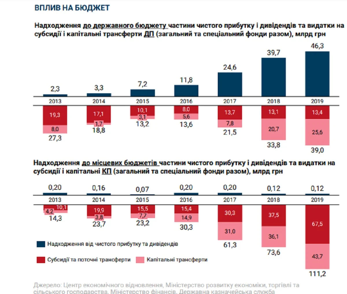 «Показатели прибыльности ГП улучшились после реформирования организационной структуры. Убытки НАК «Нафтогаз» в 2012 году составляли 10,3 млрд гривен, в 2019 году прибыль – 50,7 млрд гривен. Прибыль «Укрпочты» выросла до 496 млн гривен (с 40,5 млн гривен в 2012 году)«.