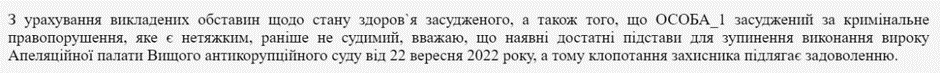 Отсрочка в исполнении приговора — исключение из общего правила отбытия наказания за содеянное. Поэтому для применения этого механизма необходимо надлежащее обоснование. Но из определения кажется, что судья Лагнюк очень легко согласился с аргументами защиты, ведь свое обоснование ограничил одним общим предложением: