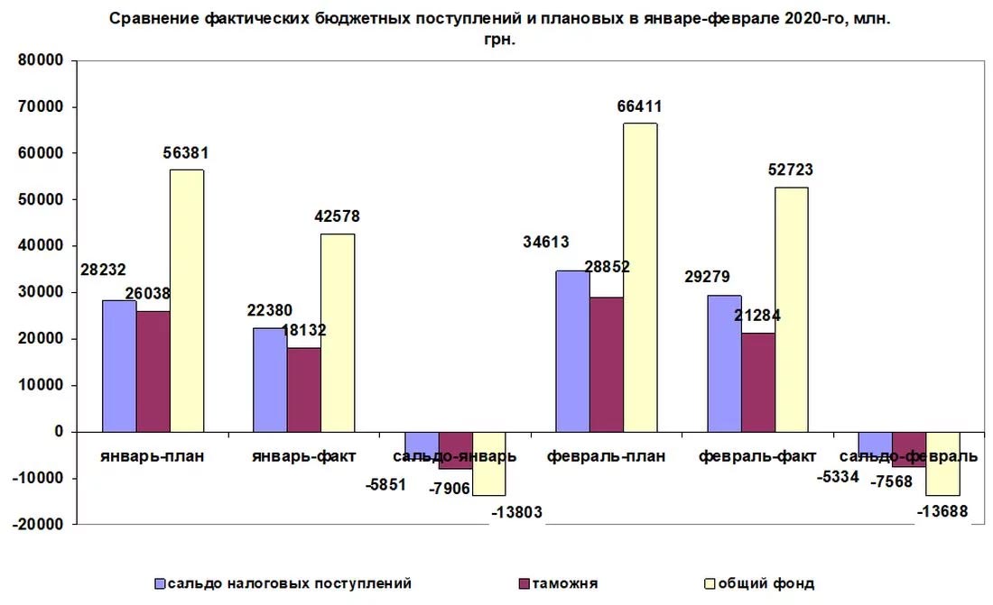 Таможня при плане в 28,85 млрд грн принесла в казну 21,28 млрд грн, то есть дефицит поступлений составил -7,57 млрд грн. Всего в общий фонд государственного бюджета не поступило 13,69 млрд грн, или более 20% от плановых показателей. Это данные Государственной казначейской службы по состоянию на 27 февраля 2020-го.