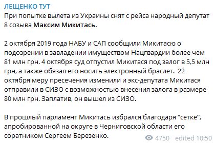 «При попытке вылета из Украины снят с рейса народный депутат 8 созыва Максим Микитась», — говорится в сообщении Лещенко в Telegram.