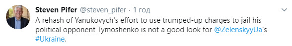 «Повторение попытки Януковича использовать сфабрикованные обвинения, чтобы посадить в тюрьму своего политического оппонента Тимошенко, выглядит нехорошо для Украины времен Зеленского», — написал Пайфер.