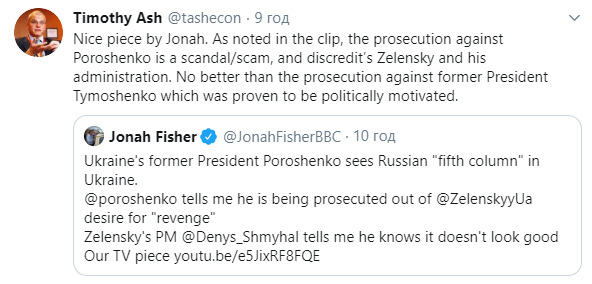 «Как указано в сюжете, обвинения против Порошенко это скандал/мошенничество и дискредитирует Зеленского и его администрацию. Не лучше обвинения против бывшего премьера Тимошенко, которое было признано политически мотивированным», — пишет в Twitter Тимоти Эш.