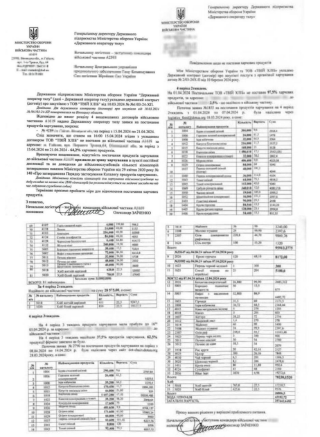 Тука ссылается на показания заместителя командира одной из боевых частей 59-й бригады, полковника Александра Заиченко: «Сухие факты: выбранный ГП «Государственный оператор тыла» (ДОТ) поставщик «Твой хлеб», с которым ДОТ месяц назад заключил соответствующие договоры, не поставил в часть 64 % продуктов. В первые две недели уровень поставок составлял 3% от потребности, и солдат кормили только за счет запасов, сделанных заранее».