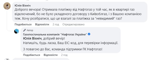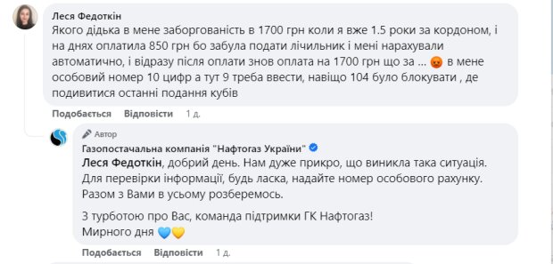 «Получила платежку от Нафтогаза в то время, как в квартире газ отключен, потому что не было заключенного договора с Киевоблгазом, и с Вашей компанией тоже. Хочу разобраться, что это вообще за платежка за «невидимый» газ?«, — написала украинка.