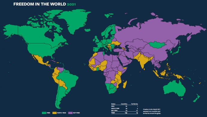 Пандемия коронавируса в 2020 году способствовала ухудшению уровня глобальной свободы, сейчас в «свободных» странах живет менее 20% населения мира, в «несвободных» — 38%.