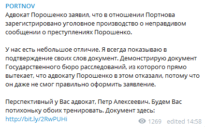 «Адвокат Порошенко заявил, что в отношении Портнова зарегистрировано уголовное производство о неправдивом сообщении о преступлениях Порошенко… Сейчас я демонстрирую документ Государственного бюро расследований, из которого прямо вытекает, что адвокату Порошенко в этом отказали, потому что он даже не смог правильно оформить заявление. Перспективный у Вас адвокат, Петр Алексеевич. Будем Вас потихоньку обоих тренировать», — написал Портнов.