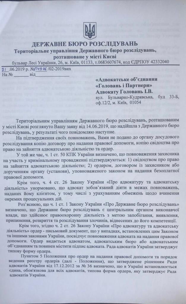 В документе указано, что адвокату Голованю отказано в регистрации уголовного производства по его заявлению, так как он не подал в орган досудебного расследования копию договора про оказание юридической помощи, копию свидетельства про право на осуществление адвокатской деятельности и ордер.