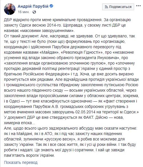 Вот такой документ. Но на самом деле не удивил. Вот что удивило, так это то, что в тексте не было (пока) формулировок об «организации, координации и осуществлении Парубием государственного переворота под кодовыми названиями «Майдан», «Революция Достоинства»», о «незаконном отстранении от власти законно избранного президента Януковича», о «захвате власти организованной преступной группой», о «преступном противодействии государственной политике реинтеграции Украины в единое пространство с братской Российской Федерацией» и т.д. Хотя, это уже достаточно определенно читается между строк. Но отчаянное противодействие украинской власти и гражданского общества гибридному захвату путинской Россией всего нашего юго-востока — восьми украинских областей, с помощью захвата власти пророссийскими силами в областных центрах, в том числе и в Одессе — здесь уже классифицируется однозначно — как «факт создания и координации Парубием А. В. общественных вооруженных группировок с целью совершения массовых беспорядков 02.05.2014 г. на территории г. Одессы». В документе ГБР это уже утверждается как ФАКТ. Действительно — новая, необычная эпоха …», — написал он.