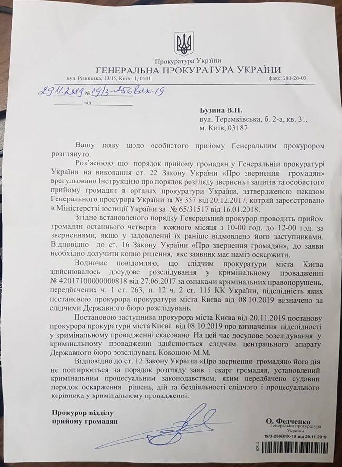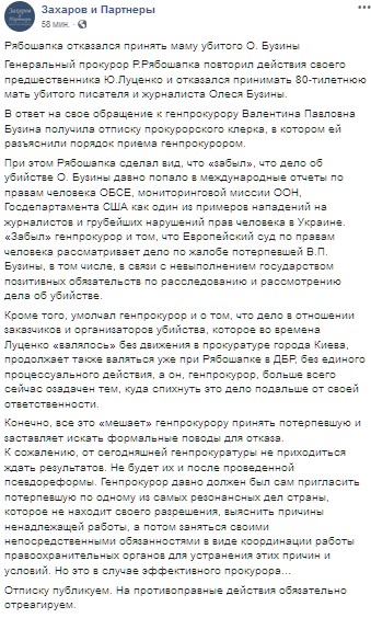 «В ответ на свое обращение к генпрокурору Валентина Павловна Бузина получила отписку прокурорского клерка, в котором ей разъяснили порядок приема генпрокурором. При этом Рябошапка сделал вид, что «забыл», что дело об убийстве О. Бузины давно попало в международные отчеты по правам человека ОБСЕ, мониторинговой миссии ООН, Госдепартамента США как один из примеров нападений на журналистов и грубейших нарушений прав человека в Украине», — говорится в сообщении.