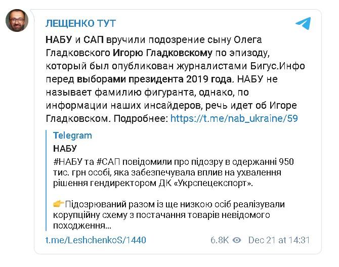 О вручении подозрения Игорю Гладковскому сообщает также экс-нардеп, член набсовета УЗ Сергей Лещенко.