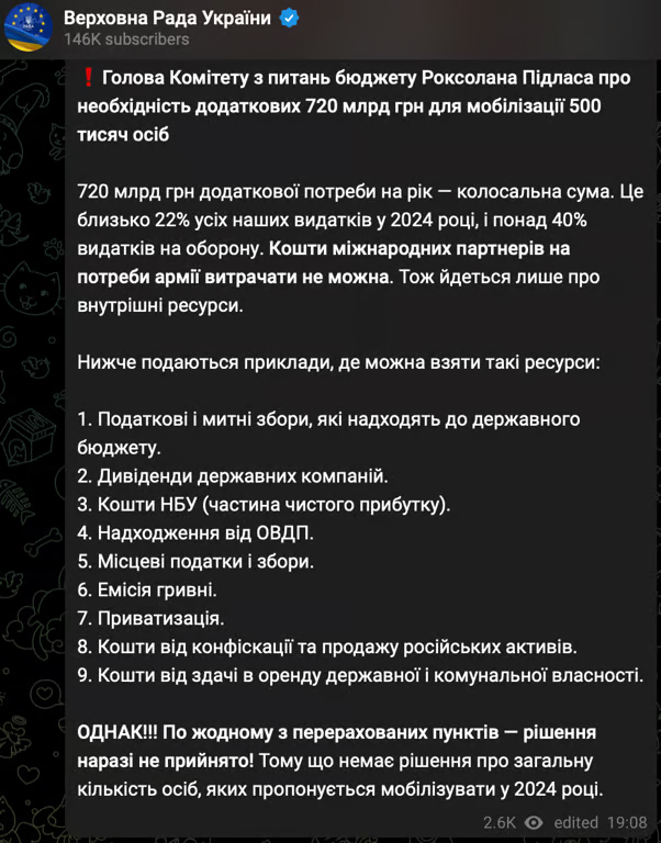 Глава Комитета по бюджету Роксолана Пидласа прокомментировала необходимость дополнительных 720 млрд грн для мобилизации 500 тысяч человек в Украине. По ее словам, это большая сумма для госбюджета, их можно получить путем налоговых и таможенных пошлин, приватизации, дивидендов частных компаний и тд.
