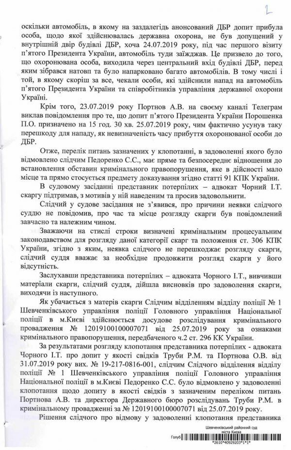 В постановлении суда написано, что допрос Трубы и Портнова нужен для того, чтобы выявить, что действительно произошло 25 июля возле здания ГБР и правильно определить, какое именно преступление было совершено.