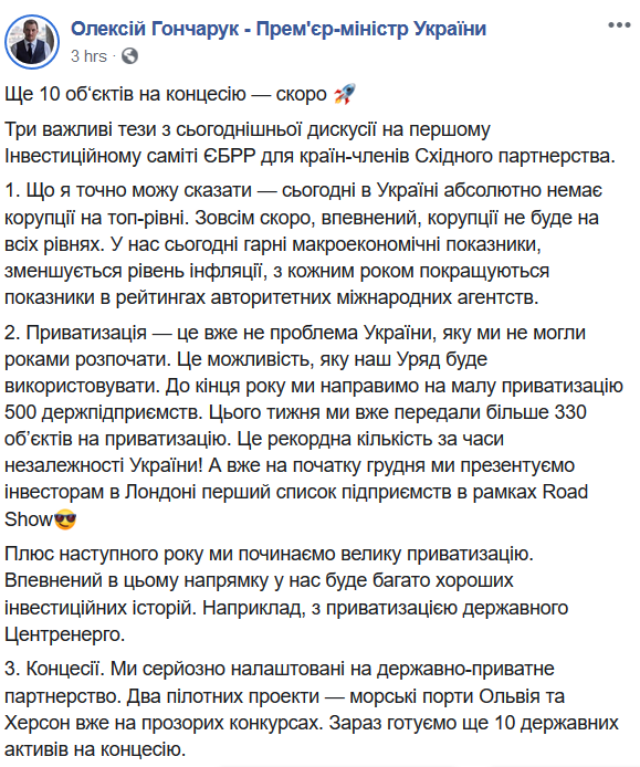 «Сегодня в Украине абсолютно нет коррупции на топ-уровне. Совсем скоро, уверен, коррупции не будет на всех уровнях. У нас сегодня хорошие макроэкономические показатели, уменьшается уровень инфляции, с каждым годом улучшаются показатели в рейтингах авторитетных международных агентств», — написал премьер в Facebook.