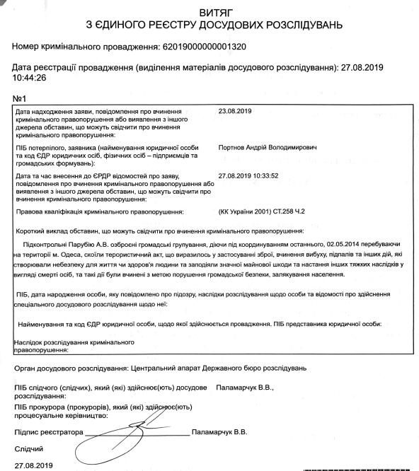 В сканах документа об открытии производства говорится, что по заявлению Портнова сведения о возможном преступлении Парубия внесены в Единый реестр досудебных расследований по признакам состава уголовного правонарушения, предусмотренного частью 2 статьи 294 Уголовного кодекса Украины — массовые беспорядки. В документе также идет речь о том, что начато досудебное расследование.