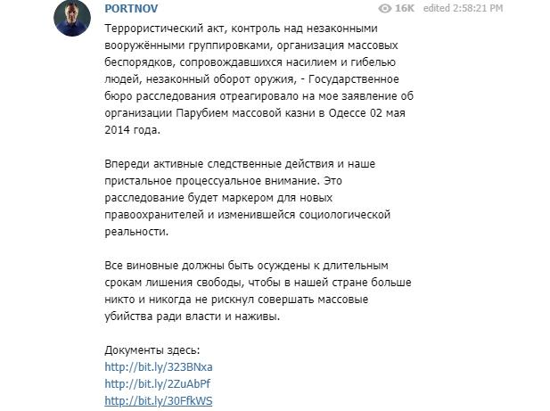 — Террористический акт, контроль над незаконными вооруженными группировками, организация массовых беспорядков, сопровождавшихся насилием и гибелью людей, незаконный оборот оружия, — Государственное бюро расследований отреагировало на мое заявление об организации Парубием массовой казни в Одессе 02 мая 2014 года, — написал Портнов.