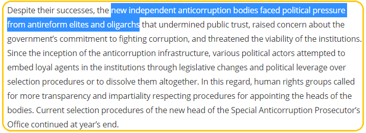 Также в Госдепартаменте отметили, что с момента создания антикоррупционной инфраструктуры в Украине разные политики пытались «вклинить» в них лояльных агентов, используя политическое давление и законодательное изменение процедуры отбора антикоррупционеров. В то же время авторы доклада призвали к прозрачности и беспристрастности в ходе назначения руководителей этих органов.
