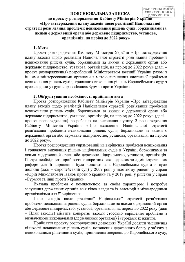 Как отмечается в пояснительной записке Минюста к этому распоряжению, «острая необходимость принятия конкретных законодательных и административных реформ для ее решения была констатирована в 2009 году Европейским судом по правам человека в пилотном решении по делу «Юрий Николаевич Иванов против Украины» и в 2017 году в решении по делу «Бурмич и другие против Украины».