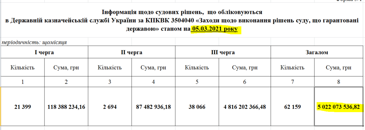 По данным Государственного казначейства Украины, по состоянию на 5 марта 2021 года долг государства по решениям судов, выполнение которых гарантировало государство, составляет 5 миллиардов грн.
