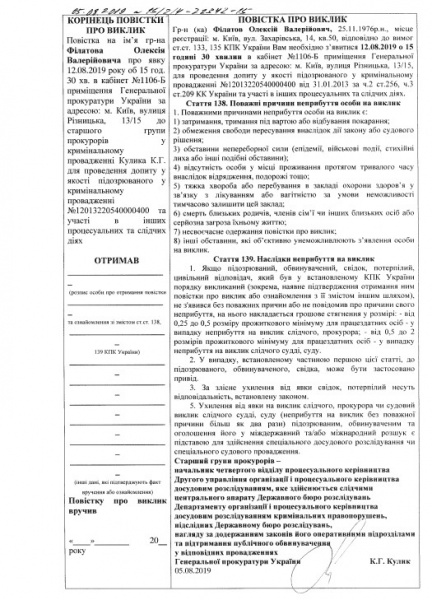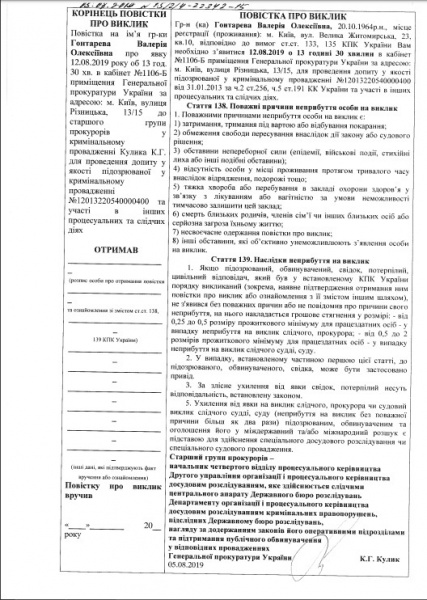 « Филатов Алексей Валерьевич… Вам необходимо явиться 12.08.2019 в 15 часов 30 минут к старшему группы прокуроров в уголовном производстве Кулика К.Г.для допроса в качестве подозреваемого в уголовном производстве №12013220540000400 от 31.01.2013 по ч. 2 ст.256, ч.3 ст.209 УК Украины и участия в других процессуальных и следственных действиях… Гонтарева Валерия Алексеевна… Вам необходимо явиться 12.08.2019 в 13 часов 30 минут к старшему группы прокуроров в уголовном производстве Кулика К.Г. для допроса в качестве подозреваемого в уголовном производстве №12013220540000400», — говорится в тексте повесток.