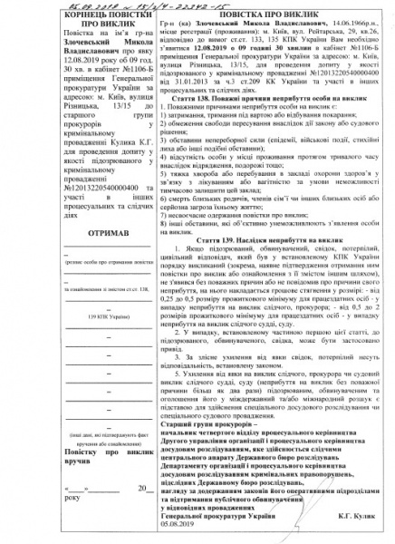 Злочевскому необходимо явиться на допрос 12 августа в 9:30.