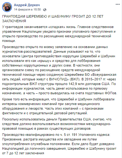 «У грантоедов заканчивается «сладкая» жизнь. Главное следственное управление Нацполиции увидело признаки уголовного преступления и открыло производство по расхищению международной технической помощи», — заявил Деркач у себя в Facebook.