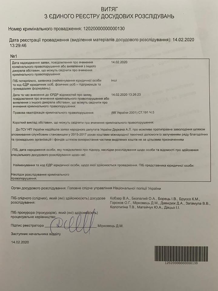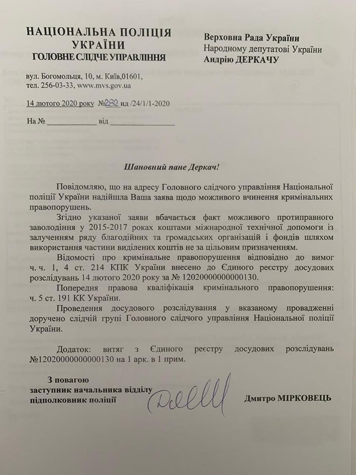 К своему посту он приложил ответ Нацполиции о том, что по его заявлению был открыто дело и данные из Единого реестра досудебных расследований о том, что уголовное производство было зарегистрировано 14 февраля 2020 года.