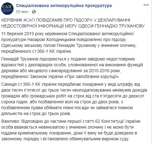 Сотрудники Специализированной антикоррупционной прокуратуры объявили подозрение мэру Одессы Геннадию Труханову в недостоверной декларации имущества. Об этом рассказали в пресс-службе САП 11 марта на своей странице в Facebook