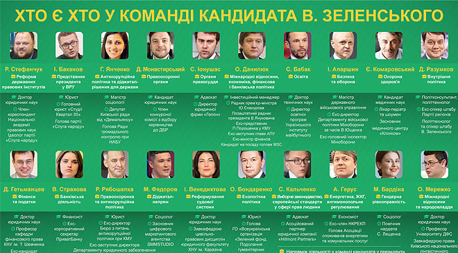 Інтрига з новими обличчями в політиці, що так довго, як театральну паузу, тримав Володимир Зеленський, нарешті трохи розвіялася в прямому ефірі телеканалу Коломойського. Кандидат у президенти представив свою команду, щоправда, відмовився говорити, хто стане міністром оборони чи міністром закордонних справ, але зазначив, що «ці люди підуть зі мною до Адміністрації президента». «Слово і Діло» пропонує подивитися на цих людей уважніше.