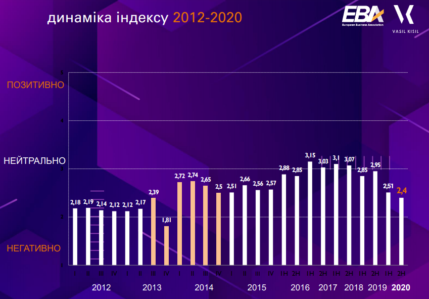 Индекс инвестиционной привлекательности Украины во второй половине 2020 года опустился до 2.40 пункта из 5 возможных, что свидетельствует о беспрецедентном ухудшении настроений руководителей иностранных и украинских компаний-членов Европейской бизнес ассоциации (ЕБА). Столь низкий показатель индекса был зафиксирован впервые с 2013 года, говорится в экспертном исследовании ЕБА, опубликованном на сайте ассоциации.