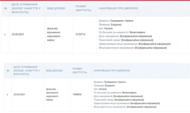 Впрочем, Давид Макарьян попытался прикрыть несовпадение доходов и расходов. В сентябре 2021 года семейство Макарьян-Кошелева сумели продать имущество, которое они непонятно, как появилось. Речь идет о доходе от отчуждения недвижимого имущества на суммы 2133712 грн и 1066856 грн.
